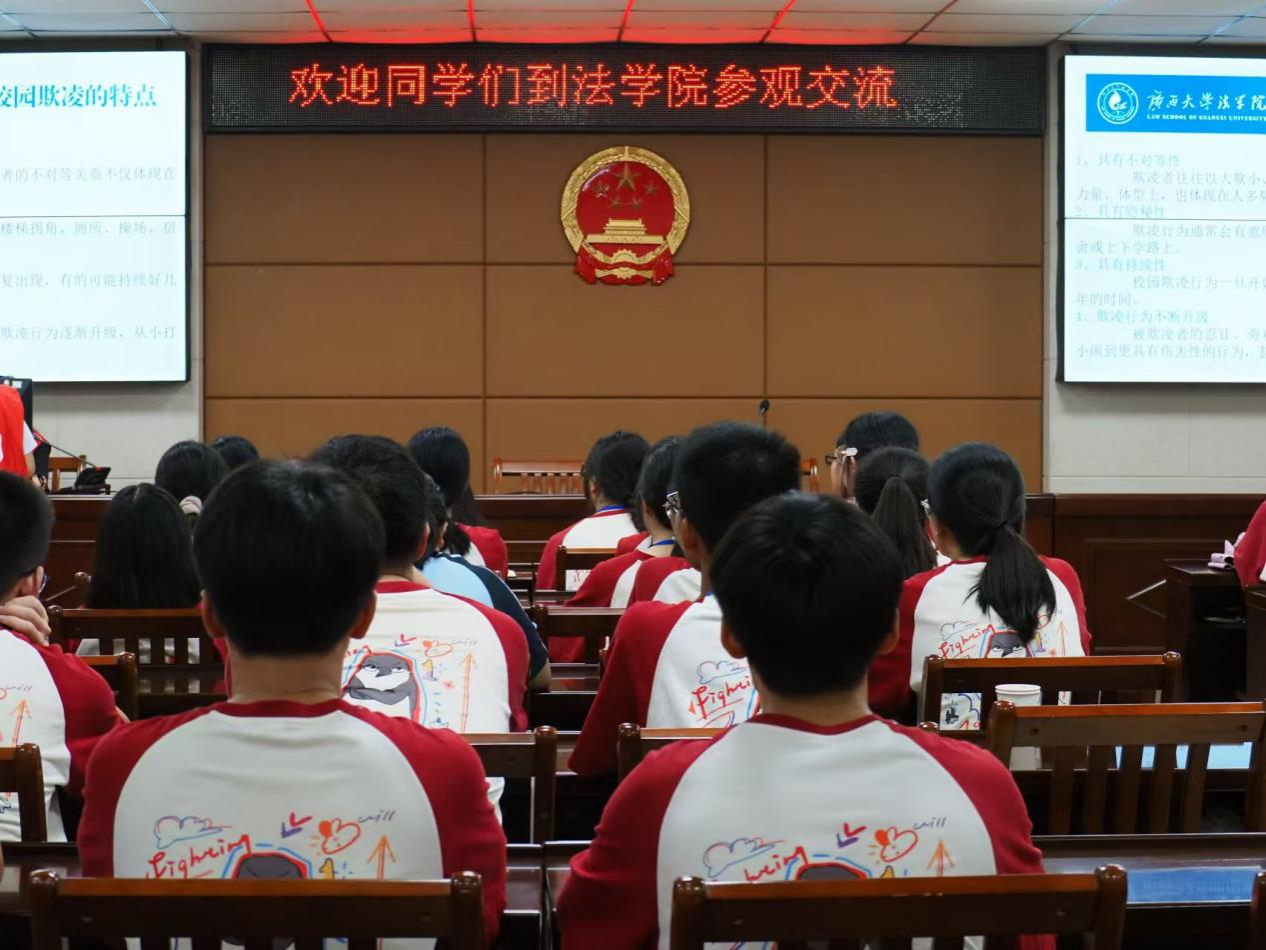 2024年10月19日上午,南宁市第十四中学的师生们踏入williamhill官网校园,前往williamhill进行游学活动。他们参观了williamhill的现代化教学设施,并积极参与了由williamhill官网法律援助中心举办的“拒绝校园欺凌法治护航成长”普法教育活动。