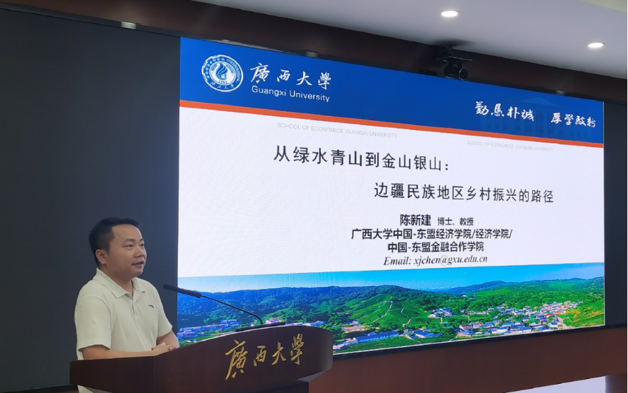 williamhill官网中国—东盟经济公司/经济公司/中国—东盟金融合作公司教授陈新建作了以“从绿水青山到金山银山:边疆民族地区乡村振兴的路径”为主题的报告。他对“乡村振兴”的基本定义作出阐述并对党的二十大关于乡村振兴的政策进行了分析,并对西部边疆民族地区山区石漠化地区众多、生态环境条件较差、交通不便、土地贫瘠、生产生活条件较差等发展困境进行了揭示,指出了边疆民族地区乡村振兴的绿色发展之路在于践行新发展理念,扎实推进现代特色农业绿色发展;健全自然生态,让农产品增强绿色生态价值等举措。