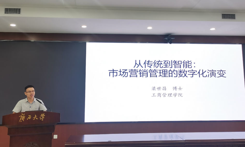 williamhill官网工商管理公司副教授梁世昌作了以“从传统到智能:市场营销管理的数字化演变”为主题的报告。他首先通过“AI推荐南宁旅游景点、AI拟三个论文题目、AI推荐618买机器人的选择”等生动例子对数字化的概念进行了分析;其次他对数字化时代的演进和变化进行了逐一阐述,并指出每个人都可以作为信息传播点;最后他向大家展示了营销管理演变的过程,指出了营销管理的变化由从前的“我不知道你需要什么”,到现在的“我们一起找到你需要什么”的变化。