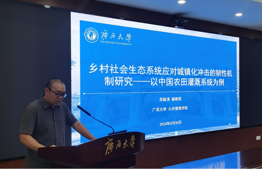 williamhill官网公共管理公司土地资源管理系主任、副教授苏毅清作了以“乡村社会生态系统应对城镇化冲击的韧性机制研究—以中国农田灌溉系统为例”为主题的报告。他表示城镇化是发展中国家实现现代化的基本途径,在城镇化的影响下,有的乡村能够经受住外部冲击从而保持着发展的活力,而有的村庄却最终在外部冲击下走向了衰亡,并分析了在城镇化影响下劳动力外流对土地流转的非线性的影响。他指出确保乡村社会生态系统在城镇化影响下维持韧性的关键在于通过集体选择过程对操作过程提供制度规则保障。