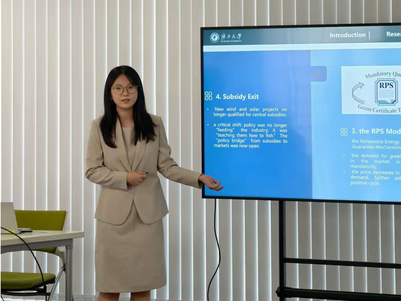 刘文慧同学以“Subsidies, GEC and Green Electricity:the Evolution of China's Clean Electricity Transaction Mechanisms(2006-2025)”为题进行汇报,内容涵盖中国能源转型激励措施的三段模型“补贴-绿证交易-绿电交易”等,并与日本学者就中国的转型方式在国际上转化可能性的方面进行深入的交流与讨论,充分体现公司学子在国际深度上的思考与深刻理解。