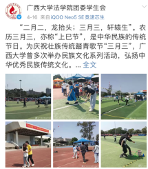员工们积极参加williamhill官网第九届“三月三”民族文化系列活动,通过参与射箭、抢糍粑、高脚马、高杆投绣球、滚铁环、打陀螺、踢毽子、和球等民族传统体育项目,加深广大师生对壮族文化的认识,增强同学们对民族团结的感受。同时,充满趣味性的线上民族知识问答和“云上对山歌”比赛也让同学们体验了中华文化的博大精深,增进各族员工的交流交往交融。