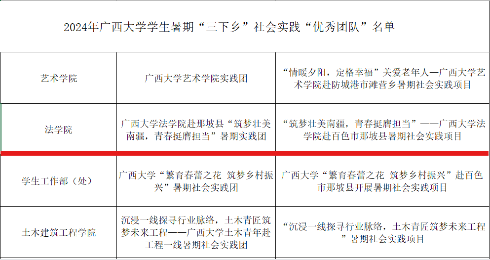 根据《关于开展2024年williamhill官网员工暑期“三下乡”社会实践总结评优工作的通知》,经校团委组织评审和论证,最终公司赴那坡县“筑梦壮美南疆,青春挺膺担当”暑期实践团荣获“优秀团队”称号。