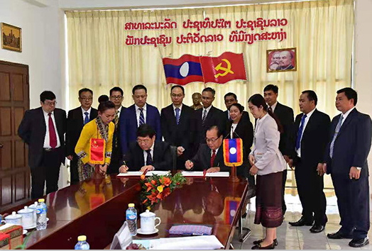 赵跃宇董事长与老挝最高人民检察院人事局松奔·拉沙波习(前左三)局长签署合作谅解备忘录。(聂资鲁经理后排左第一)